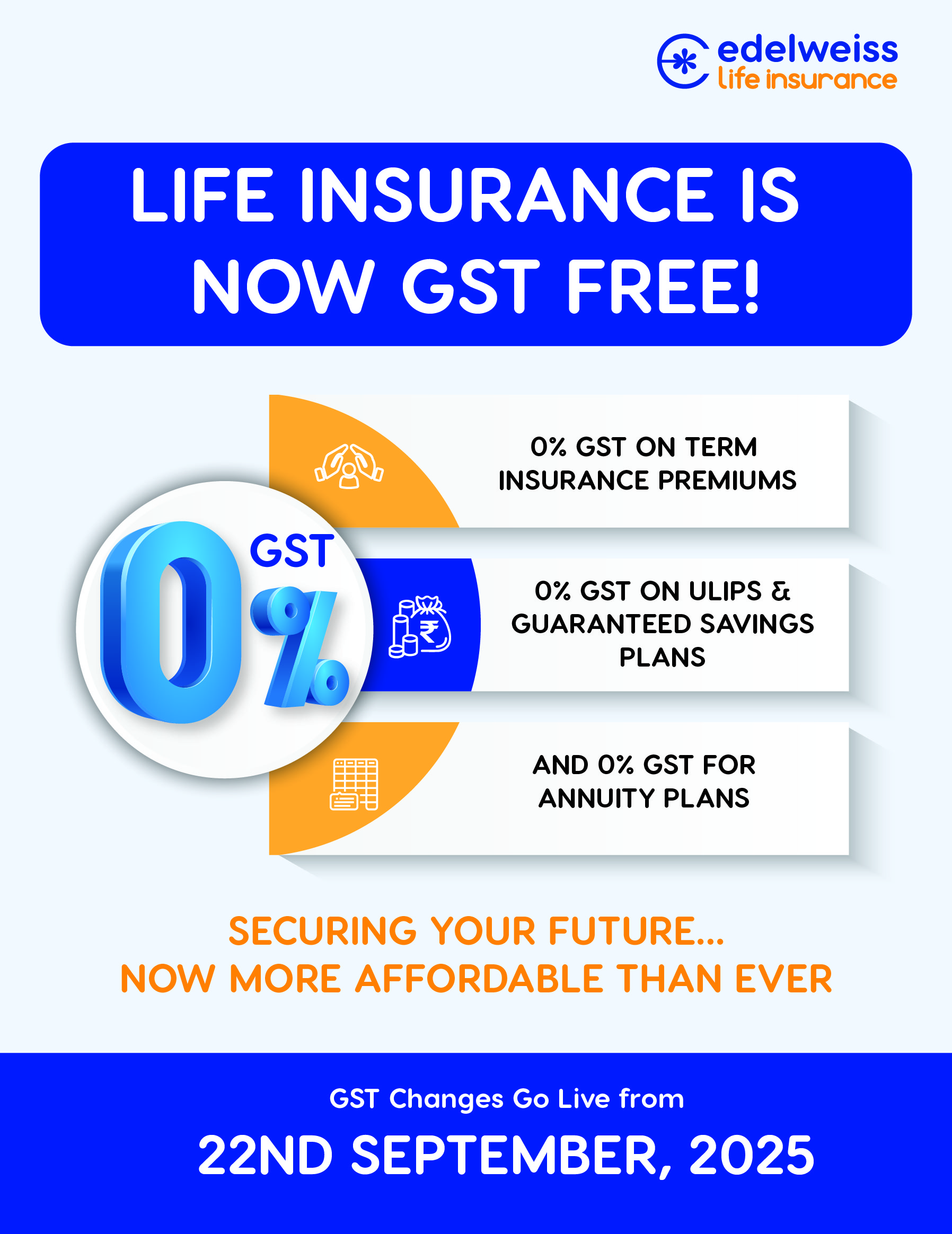 The primary goal of these GST reforms is to reduce the tax burden on the middle class, provide fairer tax brackets, and simplify the slabs for consumer convenience. These changes are expected to improve the ease of doing business, while also reducing the day-to-day expenditure for basic goods & services. Additionally, insurance providers are expecting an increase in policy issuance post September 22nd. The removal of GST charges will incentivize people to buying life insurance policies, not only as a means to protect their loved ones, but also as a way to increase their savings.